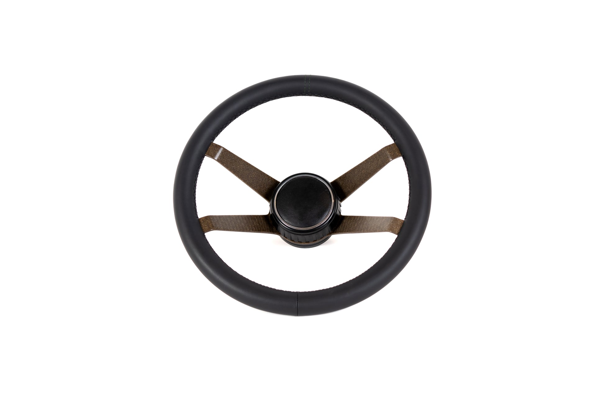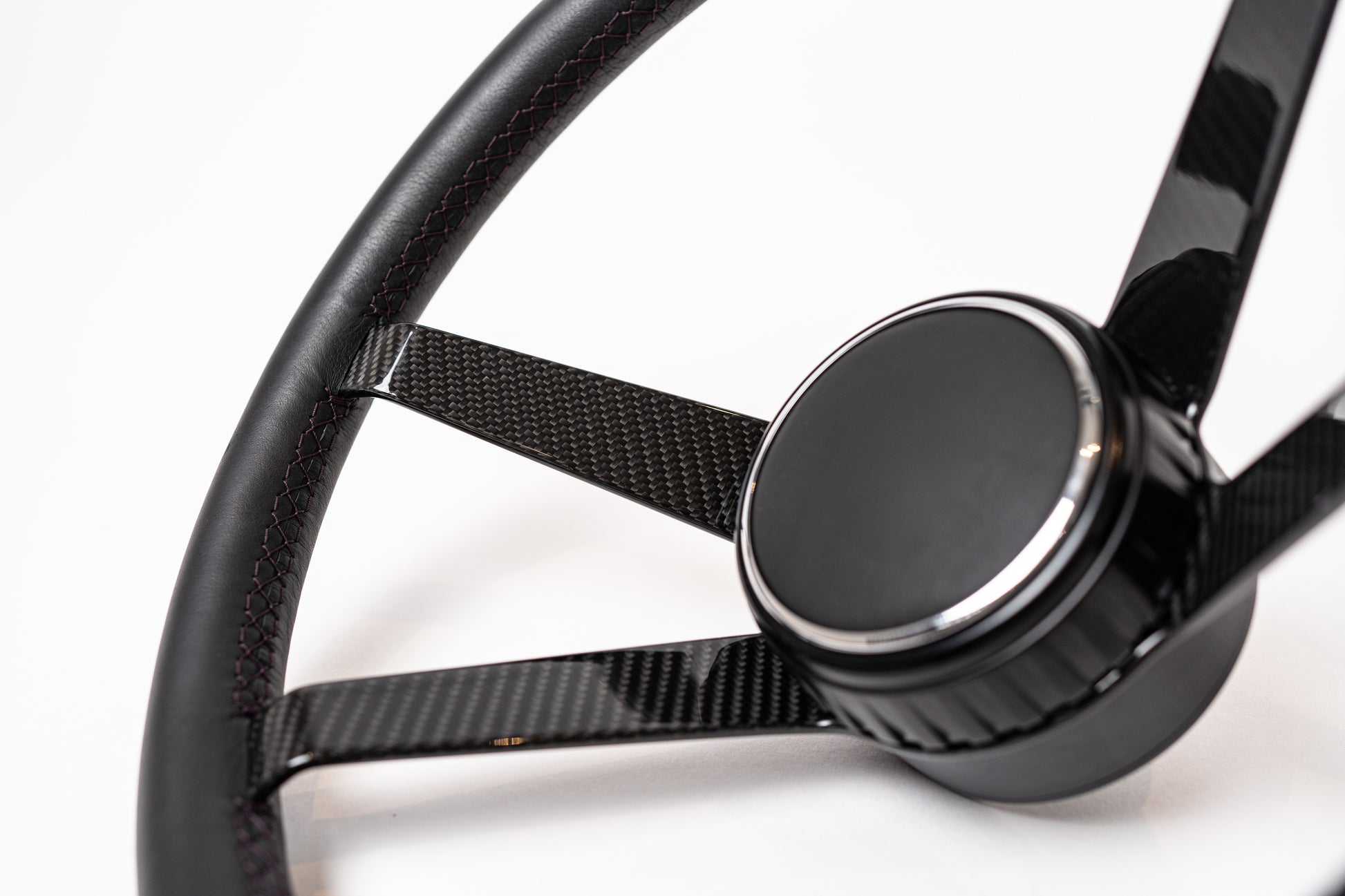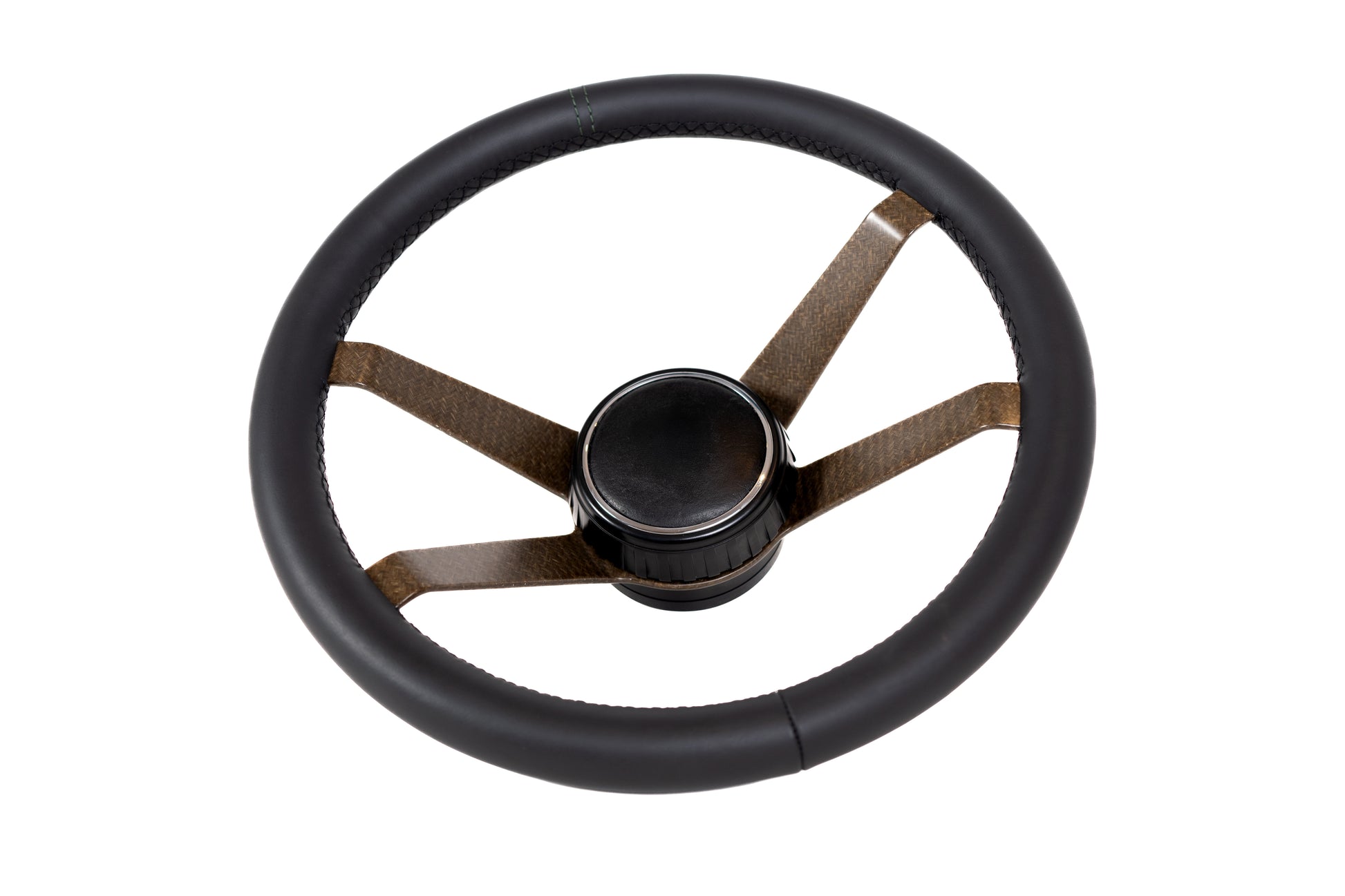 36 cm steering wheel made in either Flax or Carbon Fibre, lacquered and trimmed in black leather.