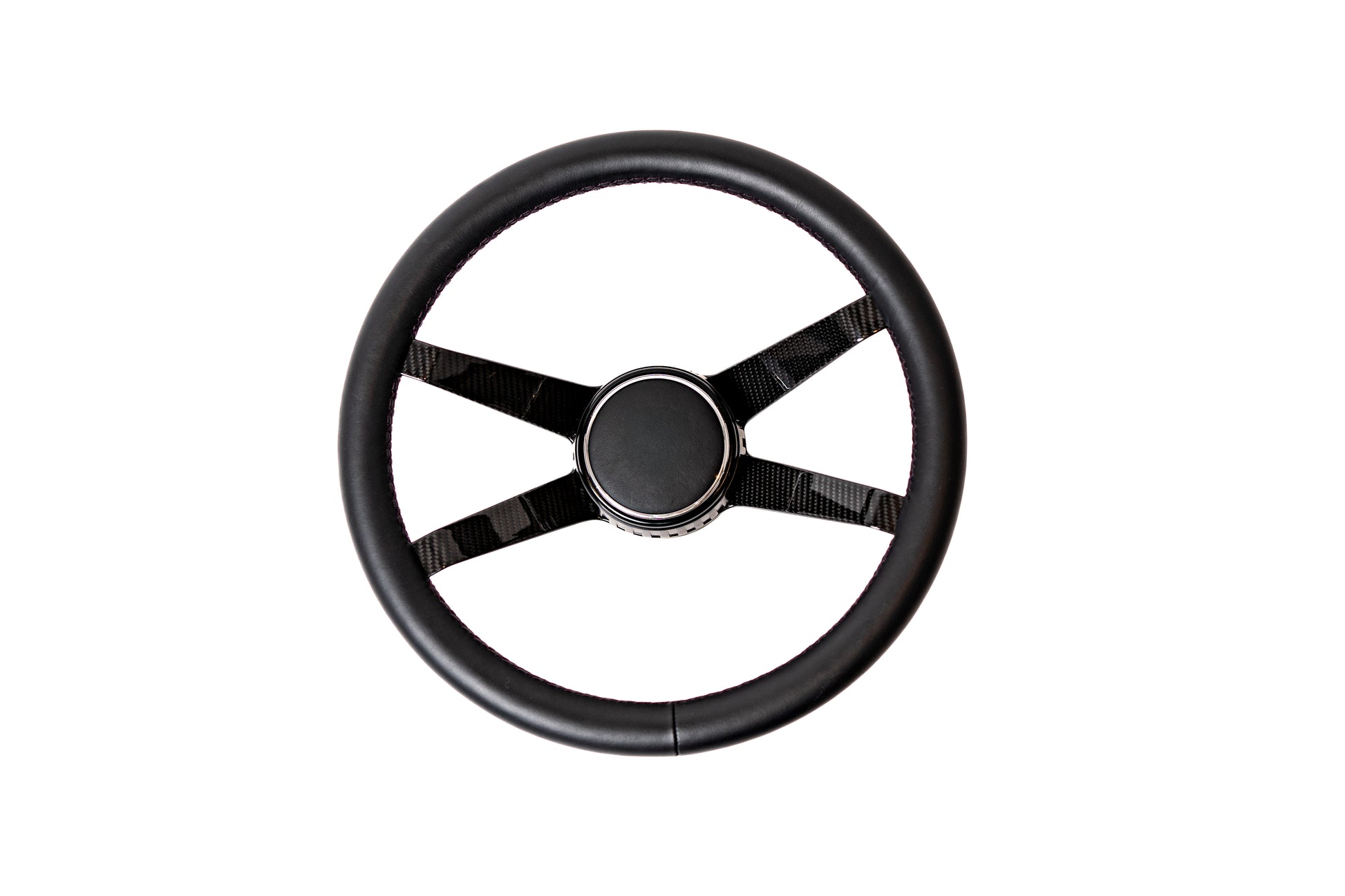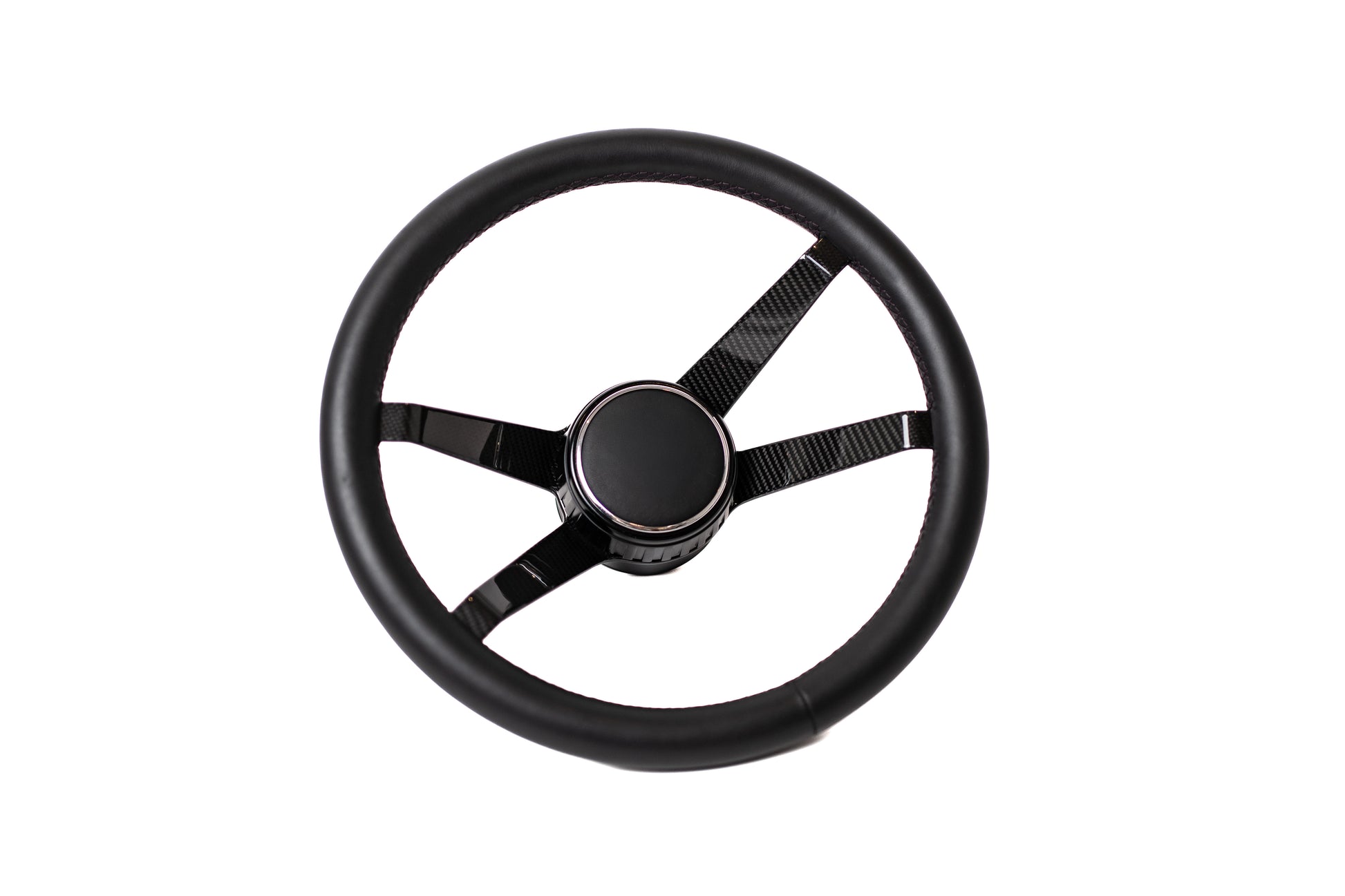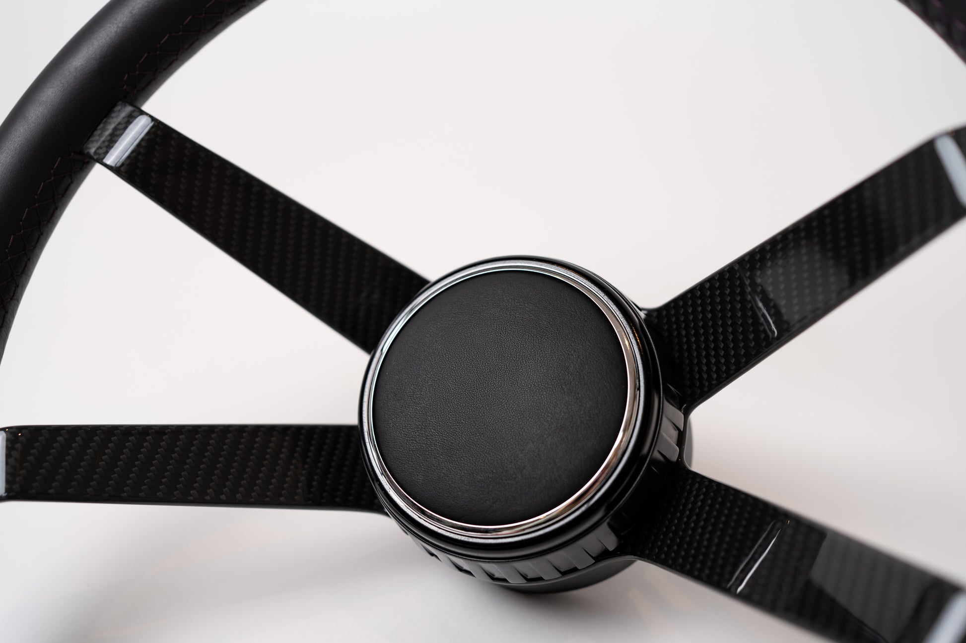 36 cm steering wheel made in either Flax or Carbon Fibre, lacquered and trimmed in black leather.
